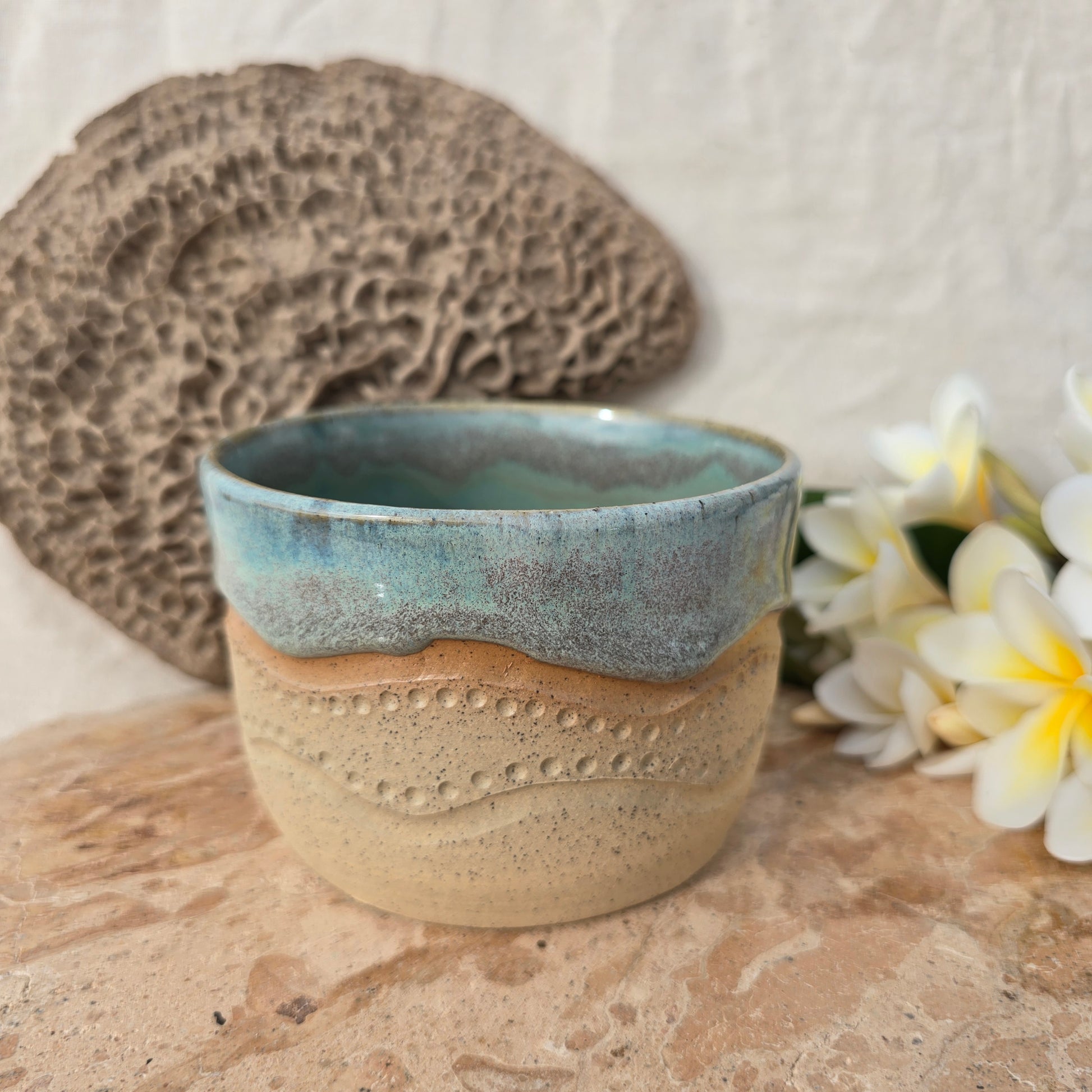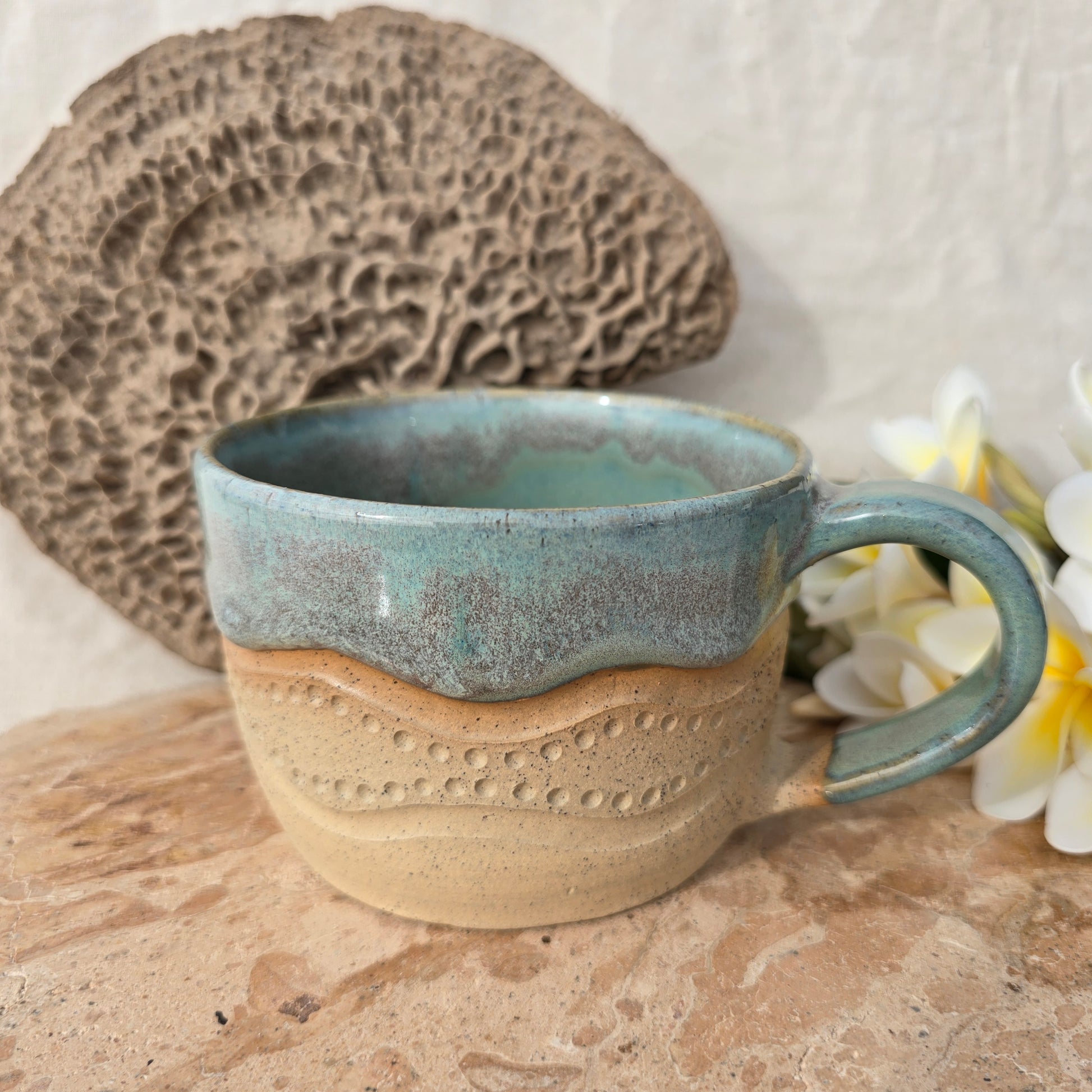 Each mug is creatively shaped on the pottery wheel. They are intricately hand carved and intentionally glazed drawing inspiration from the Eyre Peninsula coastline.