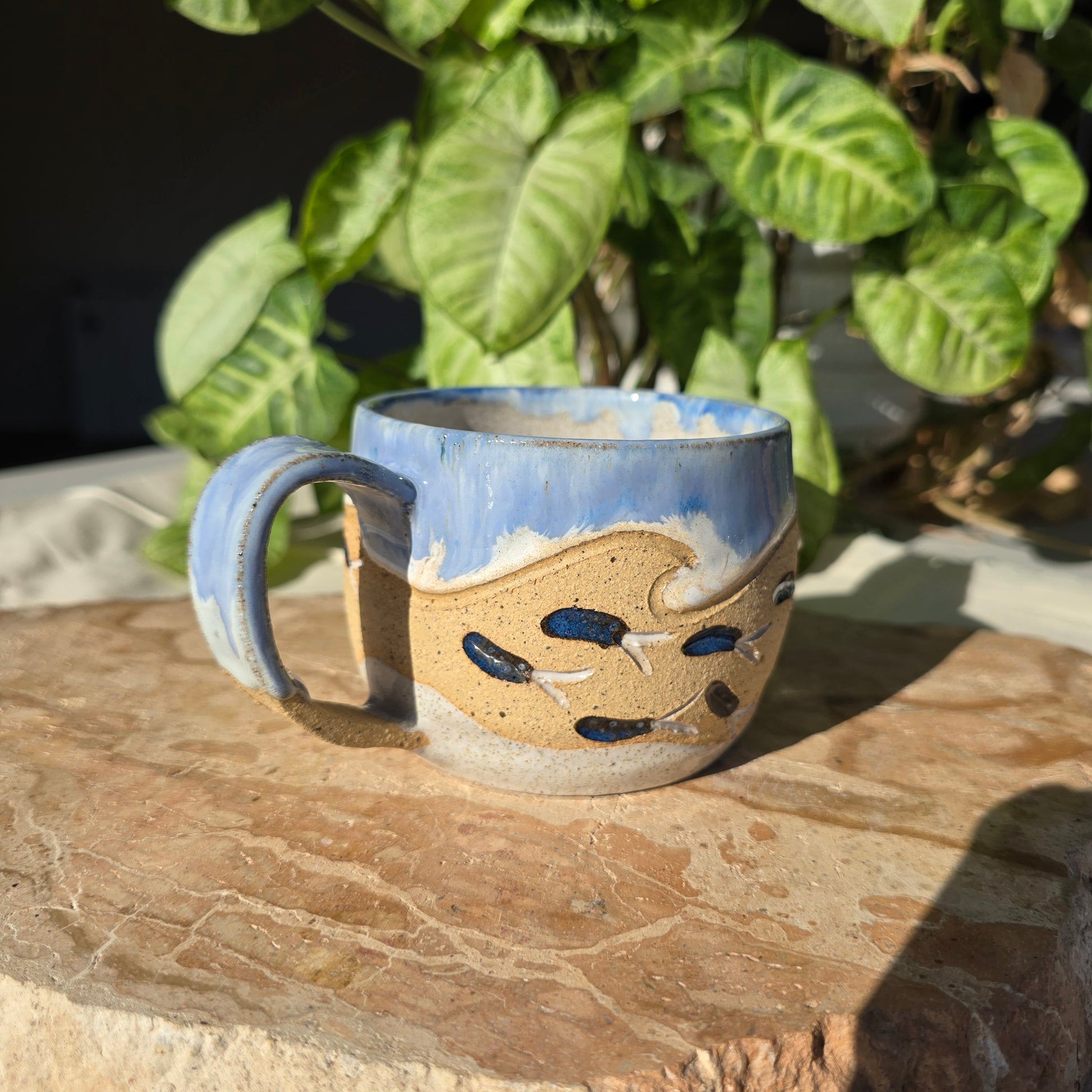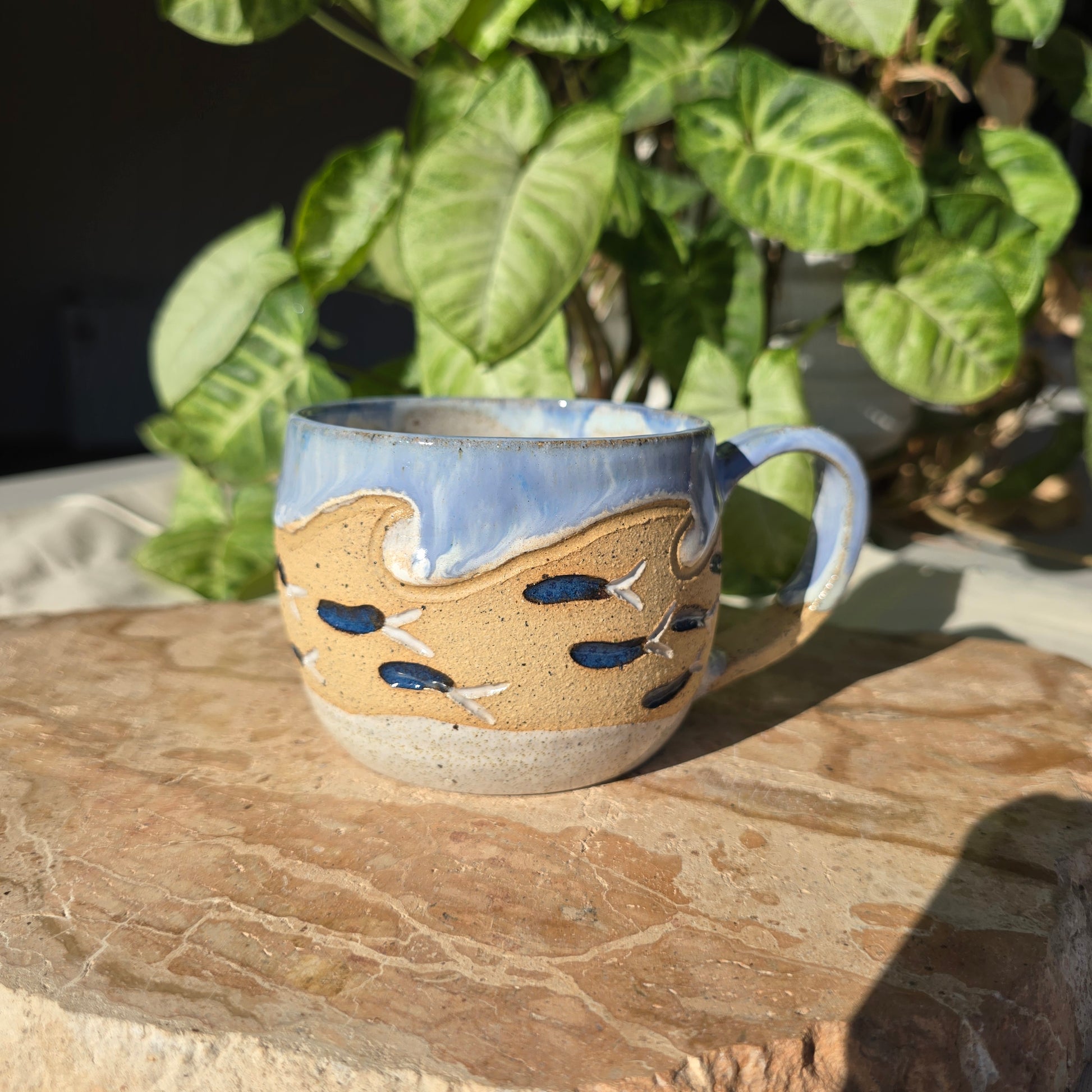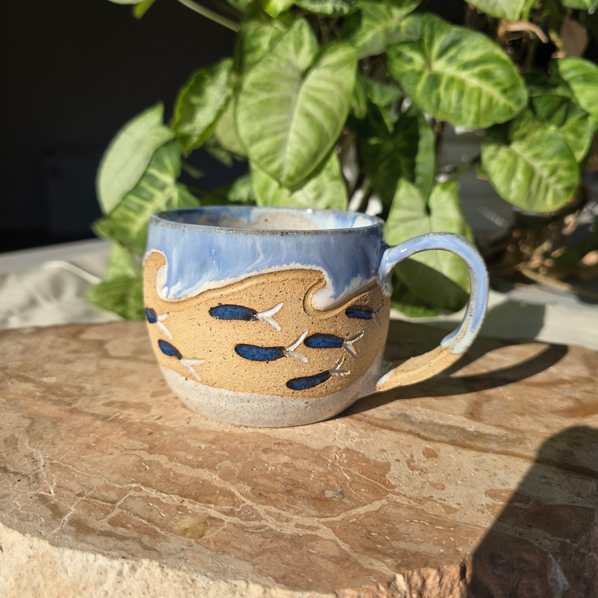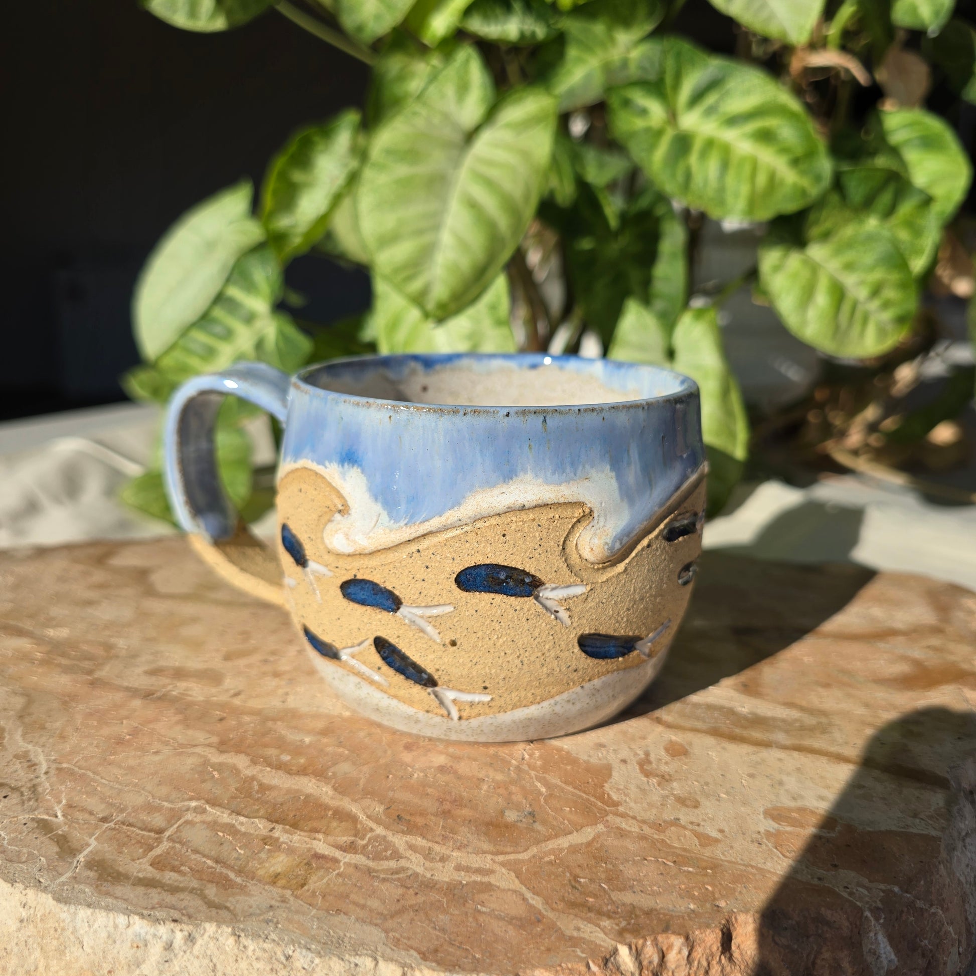 Each mug is creatively shaped on the pottery wheel. They are intricately hand carved and intentionally glazed drawing inspiration from the Eyre Peninsula coastline.