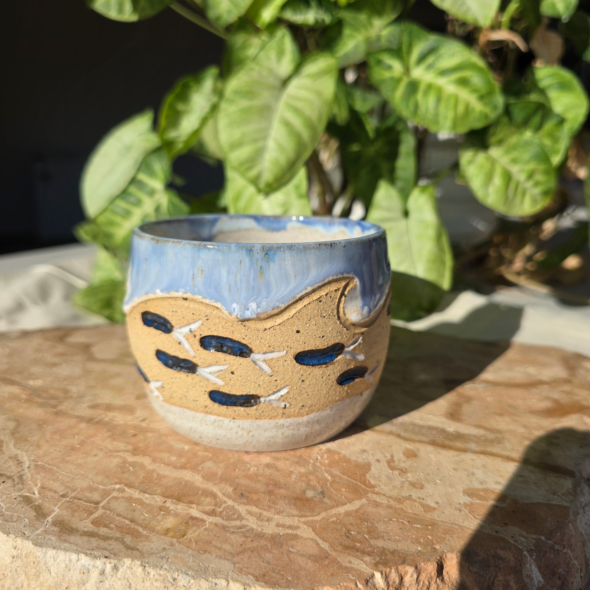 This clay body is a warm brown, with small iron flecks, like the fine sand underfoot when at the beach. They are glazed with food safe, lead-free glazes. All pieces are unique one-off designs.