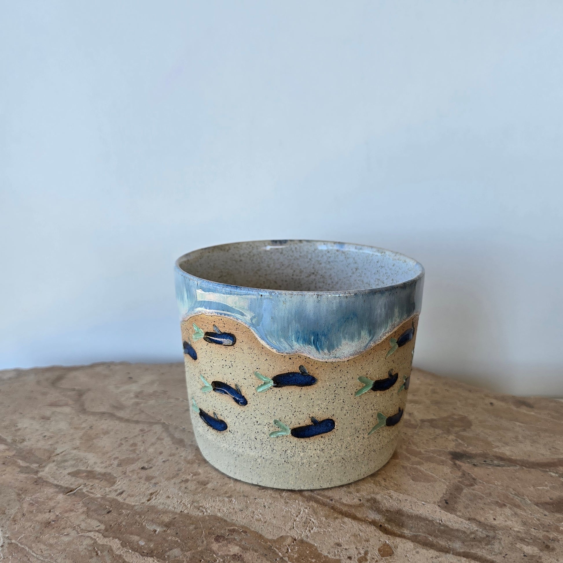 Each mug is creatively shaped on the pottery wheel. They are intricately handcarved and intentionally glazed drawing inspiration from the Eyre Peninsula coastline.